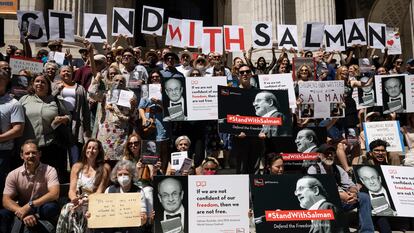 Salman Rushdie ha podido ver este viernes por streaming desde la cama del hospital de Pensilvania donde se recupera el homenaje que destacados colegas de profesión, convocados por el PEN America, le han rendido a las puertas de la Biblioteca Pública de Nueva York. El acto, justo una semana después de que un joven de 24 años intentase ejecutar la fetua iraní que le condenó a muerte en 1989, reunió a escritores de la talla de Paul Auster, Siri Hustvedt, Gay Talese, Jeffrey Eugenides o Hari Kunzru, entre una docena de nombres prestigiosos, para recordar al autor angloíndio con la lectura de fragmentos de sus libros. En la escalinata de acceso de la venerable institución, abierta al tráfago de turistas que discurría por la Quinta Avenida, el recuerdo de Rushdie flotaba en el ambiente como el genio en la botella del cuento: un demiurgo cuya sola invocación transforma el mundo.