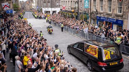 El cuerpo de Isabel II abandonó el domingo por la mañana, pasadas las 10.00 (una hora más en la España peninsular), el castillo de Balmoral, donde falleció el 8 de septiembre. Iba rumbo a Edimburgo, por carretera, en una comitiva rodante liderada por el féretro de la monarca, totalmente a la vista, cubierto por una estructura transparente. A su paso por algunas localidades norteñas ―hizo escala en Ballater, Aberdeen y Dundee―, sentidas lágrimas y el color negro acompañaron el cortejo con más énfasis que en una gran ciudad como Edimburgo. “Es una capital cosmopolita y no especialmente monárquica”, dice Brigitte Shaun, productora de 36 años. “De hecho, me da la sensación de que aquí se está viviendo de manera diferente, más relajada, de lo que se ve que pasa en Londres”, prosigue la mujer. Aunque en la Royal Mile ―en pleno casco viejo y donde se suceden icónicos monumentos relacionados con la realeza: el castillo de Edimburgo, la catedral de San Gil y el palacio de Holyroodhouse―, se concentraron miles de personas; horas antes, por la mañana, la aclamación de Carlos III despertó menos interés y, a diferencia del consenso que genera la monarquía en Abeerdenshire, más al norte, se oyeron algunos abucheos así como tímidas llamadas a la república.