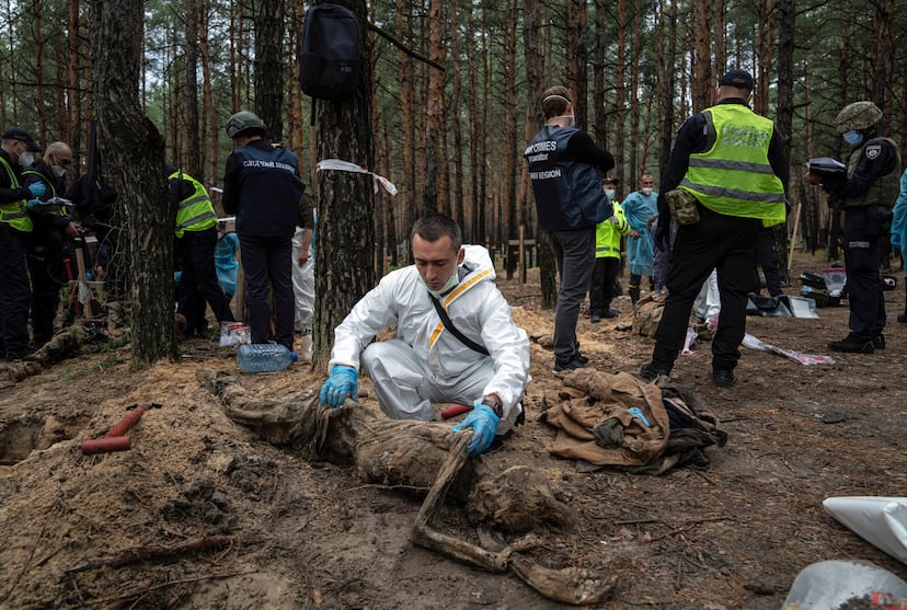 Una zona boscosa de Izium, localidad al noreste de Ucrania recientemente recuperada de manos rusas por las tropas locales, se ha convertido ya en otro de los grandes símbolos de la masacre de las tropas de Rusia en Ucrania. Más de 200 cruces de madera, algunas numeradas, señalaban en el bosque la existencia de un enterramiento masivo de víctimas de la guerra. Hasta ahora se han encontrado más de 440 cuerpos. Entre las primeras exhumaciones se han encontrado niños, familias enteras, según el presidente ucranio, Volodímir Zelenski. También personas con signos de tortura, las manos atadas a la espalda, e indicios que indican muerte por disparos, fuego de artillería o explosiones de minas. “El mundo entero debería ver esto”, ha alertado este viernes el dirigente. Ya hay abierta una investigación, con participación internacional, para obtener los detalles de esas muertes que recuerdan a escenas ocurridas en otras ciudades como Mariupol, en el sur de Ucrania, o Bucha, en los alrededores de Kiev, y que Zelenski considera sin ambages crímenes de guerra.