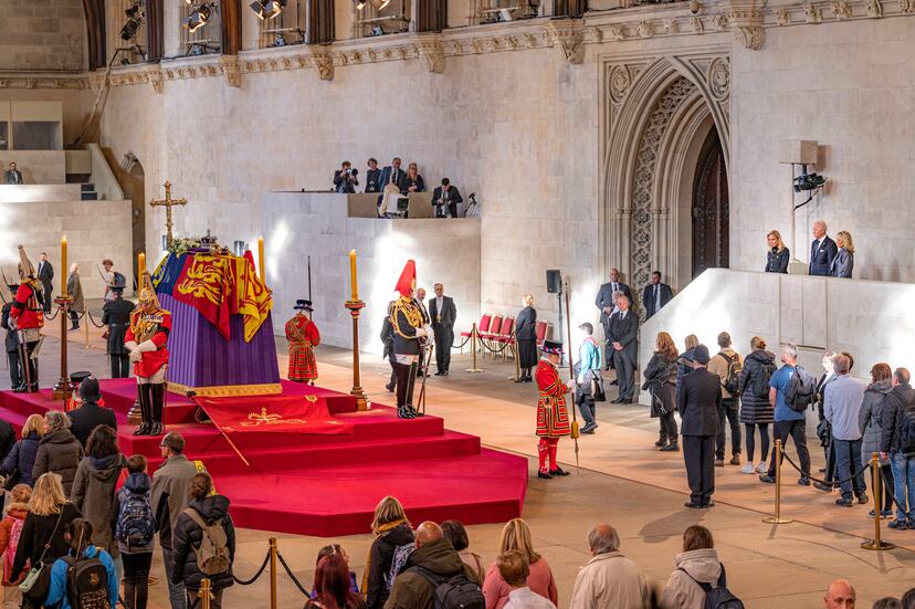 Biden se santiguaba ante el catafalco, mientras decenas de personas seguían desfilando a ambos lados del ataúd, después de más de 10 horas de espera. También pasaban por la capilla ardiente el presidente de la República de Francia, Emmanuel Macron, junto a su esposa Brigitte; el primer ministro de Canadá, Justin Trudeau, o la de Nueva Zelanda, Jacinta Ardern, así como la presidenta de la Comisión Europea, Ursula von der Leyen, y el del Consejo Europeo, Charles Michel.