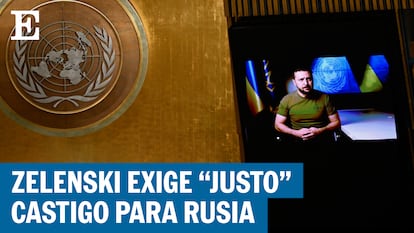 Un “justo castigo” contra Rusia por su “crimen contra Ucrania”. Que se prive a Moscú de su derecho de veto como miembro permanente del Consejo de Seguridad de Naciones Unidas, y que se aísle a sus delegaciones. Es lo que ha pedido el presidente ucranio, Volodímir Zelenski, una y otra vez en su intervención por vídeo del miércoles ante los líderes mundiales en la Asamblea General de la ONU. Una intervención, probablemente la más esperada del cónclave anual y que finalizó con un largo aplauso de la mayoría de los delegados, puestos en pie.