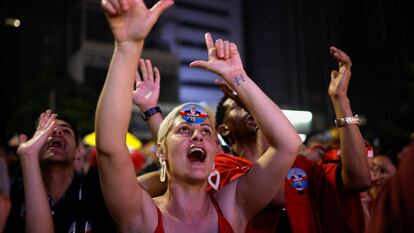 Además de mucha ilusión y entusiasmo, en la calle se respira alivio. Para el Brasil progresista, estos han sido cuatro años de infierno. Un señor solloza en una videollamada con su hija, un grupo de mujeres se abraza, una pareja gay llora mientras se besa. “Ganamos, mi amor”, le dice uno al otro, “ganamos”. Durante las últimas horas, los votos caían con cuentagotas en los celulares de miles de brasileños que presenciaban una de las elecciones más reñidas de la democracia brasileña. A las siete y media de la tarde ya no había dudas, vuelve al Gobierno un icono de la izquierda latinoamericana. Un héroe para muchos en Brasil. En un país dividido en dos, la mitad lulista parece que amanecerá ronca.