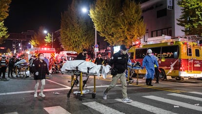 Aparte de los zapatos —no hay nada más desasosegante que un zapato sin dueño—, la policía de Seúl también recogió teléfonos, abrigos, gafas, pelucas, orejas de conejito y máscaras de monstruos. Forman parte de los 1.500 kilos de objetos que quedaron esparcidos por la red de callejones donde murieron 156 personas durante las celebraciones de Halloween en el barrio de Itaewon. Cuando todavía no los habían recogido, un hombre mayor, el dueño de una joyería que está justo en el callejón donde murieron la mayoría de las personas, extendió una estera temprano en la mañana del lunes, dos días después de lo ocurrido. Sobre ella dispuso tazones con arroz, cucharas, palillos, platos con frutas y dos velas. Las encendió y luego se arrodilló sobre el pavimento e hizo una venia profunda hasta tocar el suelo con la frente. Les pedía perdón a los muertos. Alcanzó a hacer su ritual por unos minutos hasta que un policía se le acercó. Tenía que irse. Llegaron otros policías. Les explicó por qué debía hacerlo. Por qué era una obligación. Les exigió que le dejaran hacerlo. No había caso, tenía que levantarse. Antes lloró entre espasmos sobre el hombro de un agente como si su nieta hubiera muerto esa noche.
