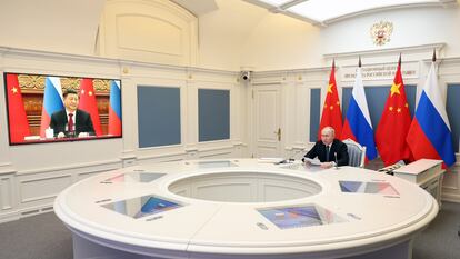 El presidente ruso, Vladímir Putin, manifestó este viernes su deseo de reforzar la cooperación militar con China durante una reunión por videoconferencia con el líder chino, Xi Jinping, en la que elogió la resistencia de Moscú y Pekín a las “presiones” occidentales. “En un contexto de provocaciones y presiones sin precedentes por parte de Occidente, defendemos nuestras posiciones de principio”, declaró Putin. “La coordinación entre Moscú y Pekín en la escena internacional (...) está al servicio de la creación de un orden mundial justo basado en el derecho internacional”, declaró el mandatario ruso, que también anunció que Xi viajará la próxima primavera a Moscú para una visita de Estado.