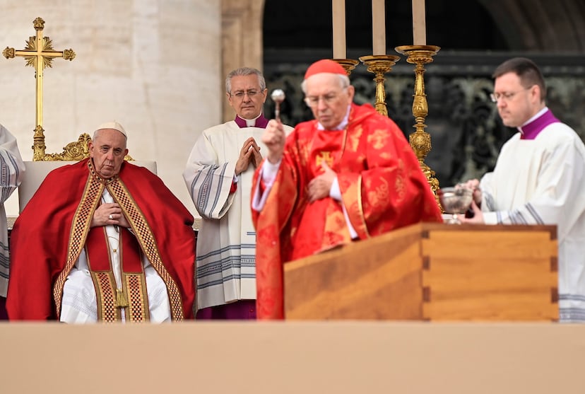 Pocos minutos antes de las 9.30, dos guardias suizos se colocaron junto al féretro de Benedicto XVI. Fue justo antes de que el papa Francisco apareciese en silla de ruedas, empujada por un ayudante, y subiese por una rampa lateral al altar de la plaza, cubierta todavía por la niebla. Sus problemas de movilidad, desde hace más de un año debido a los dolores en una rodilla, le impiden caminar con normalidad. Por ese motivo, pese a que presidió la celebración, le ayudaba en el altar el decano del colegio cardenalicio, Giovanni Battista Re, que condujo el rito. Pese a ello, Francisco realizó la homilía, muy religiosa y con pocas referencias directas al difunto. Hasta el momento final: “Benedicto, fiel amigo del Esposo, que tu gozo sea perfecto al oír definitivamente y para siempre su voz”.