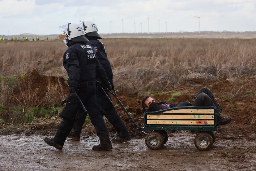 Para los manifestantes, demoler un pueblo con 900 años de historia para extraer carbón en 2023 es algo inconcebible, una línea roja que impactaría en el objetivo de mantener el calentamiento global por debajo de 1,5 grados y mancharía de forma irreversible la reputación de Alemania como pionera en transición energética. El último recurso ante los tribunales le dio la razón a RWE el lunes. Tras conocer la inminencia del desalojo, los activistas se subieron a los tejados de las granjas y se encadenaron a vallas y postes. Algunos se encaramaron a unas estructuras altas hechas con largos palos de bambú.