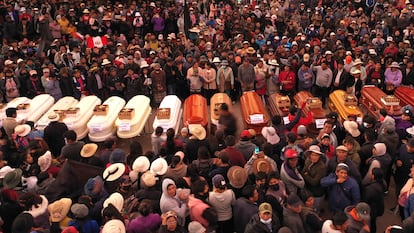 La jornada comenzó con 18 féretros apostados en los exteriores del hospital Carlos Monge Medrano, en Juliaca, en la provincia de San Román, en el sur de Perú. En medio del horror por las muertes de los manifestantes del fatídico 9 de enero afloró la solidaridad. Un grupo de funerarias donó ataúdes para que los familiares pudieran despedir a los suyos con dignidad. No es casual que alguna de ellas lleve por nombre Luz Divina. Aquel acto de humanidad ha brillado como un resplandor frente a la indolencia que sufre el país andino desde que estallaron las protestas tras el autogolpe fallido de Pedro Castillo, hoy en prisión preventiva.