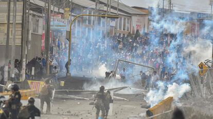 La multitudinaria marcha de manifestantes que reclaman la dimisión de la presidenta de Perú, Dina Boluarte, y la convocatoria de una Asamblea Constituyente ha chocado la tarde de este jueves con el enorme despliegue policial que cerca el perímetro de la capital. Se han producido enfrentamientos en varios puntos, entre ellos el centro y la zona residencial de San Isidro. Las fuerzas de seguridad ha lanzado bombas lacrimógenas en la enésima jornada de protesta que ha dejado otros dos muertos, uno en Arequipa y otro en Macusani, en el sur del país. Desde el comienzo de las movilizaciones han fallecido 55 personas, la mayoría a manos de los cuerpos de seguridad.