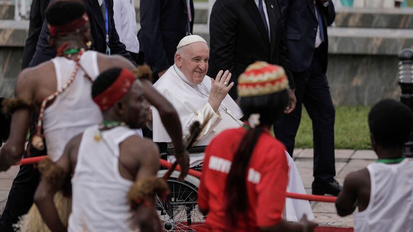 Francisco aterrizó este martes en Kinsasa, capital de la República Democrática del Congo y primera parada del viaje que le llevará también hasta el domingo a Sudán del Sur, dos de los países más peligrosos del continente y uno de los pocos lugares donde el catolicismo mantiene su vigor. El viaje tuvo que ser aplazado el pasado julio por los problemas de rodilla del Pontífice, como él mismo recordó durante el vuelo. Nada más llegar, ante el presidente del país, Félix Tshisekedi, comenzó a desgranar su visión de los conflictos que azotan el país. “Quiten las manos de la República Democrática del Congo, no toquen el África. Dejen de asfixiarla, porque África no es una mina que explotar ni una tierra que saquear. Que África sea protagonista de su propio destino”, lanzó en un largo y profundo discurso en el que defendió de principio a fin la dignidad del continente ante los abusos políticos: internos e internacionales.