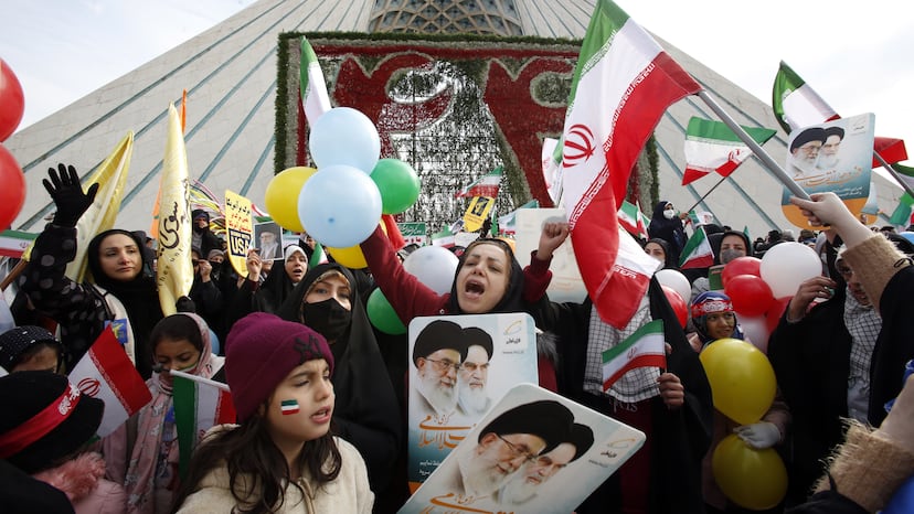 Teherán era una fiesta este sábado, pero una fiesta solo para los fieles del régimen y solo en los alrededores de la plaza Azadi (Libertad). Allí tuvieron lugar los fastos por el 44º aniversario de la República Islámica, una celebración a la que muchos iraníes de otros barrios de la capital, desiertos en ese día festivo, volvieron la espalda. Como un ejército, una multitud obediente coreaba “Muerte a América” y “Muerte a Israel”, mientras se repartían banderas y fotos del difunto ayatolá Jomeini y un hombre vendía globos de Bob Esponja. En esa marea humana predominaba el negro. Es el color del chador, la prenda que cubre el cuerpo desde la cabeza hasta los pies, y que este sábado lucía la inmensa mayoría de las mujeres que acudieron a loar a la República Islámica.