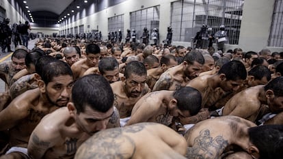 El presidente de El Salvador, Nayib Bukele, que ha hecho de las redes sociales su principal tribuna política, ha vuelto el miércoles a lanzar uno de sus tuits favoritos. Dos frases escuetas, incluido un recado para sus críticos, y un vídeo espectacular. El anuncio es el traslado de 2.000 presos más a la supercárcel de máxima seguridad, que inauguró hace poco más de un mes con otro de sus habituales despliegues mediáticos como el golpe definitivo en su guerra contra las pandillas. La semana que viene se cumplirá un año desde que Bukele decretó un duro régimen de excepción, que ya va por 11 prórrogas y que limita derechos y libertades constitucionales en todo el país. Tanto la comunidad internacional como organizaciones salvadoreñas de derechos humanos acusan al Gobierno de usar la tortura, arrestos arbitrarios y desapariciones forzadas en su embestida contra las llamadas maras. El Gobierno, por su parte, responde con poca información, más allá de los mensajes en redes sociales del presidente, y saca pecho de una reducción histórica de la violencia.