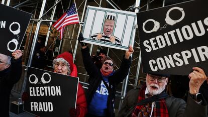 ¿Se esperan protestas? El volcán informativo que entró en erupción el sábado por la mañana incluía un llamamiento a sus seguidores a protestar para “recuperar” el “país”. Esas palabras refrescaron los ecos de los mensajes que mandó en los días previos al asalto al Capitolio. Nueva York y Washington reforzaron la seguridad el martes en puntos clave de ambas ciudades, donde, de momento, se pudo ver a más reporteros que simpatizantes. Los medios informaron la semana pasada de que varias agencias federales y locales mantuvieron reuniones para prepararse para la eventualidad de una explosión de descontento entre sus seguidores.