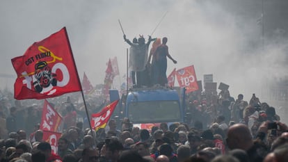 Además de las manifestaciones, se han declarado en huelga sectores clave como la energía, los transportes o la educación. La jornada de paros y manifestaciones y coincide con la presencia de Macron en el Consejo Europeo de Bruselas. Las ocho anteriores no lograron disuadir al presidente francés en su empeño por reformar el sistema de pensiones. Pero la del jueves tenía algo distinto. Era la primera después de unos días en los que las manifestaciones han abocado a Francia a una crisis política y social cuyo único antecedente reciente es la revuelta de los chalecos amarillos en 2018. Y, más que en los días anteriores, sobrevolaba las protestas un aire de chalecos amarillos: los choques con los antidisturbios, los gases lacrimógenos, los incendios de mobiliario urbano y de las basuras que estos días inundan las esquinas de París por la huelga en la limpieza pública.