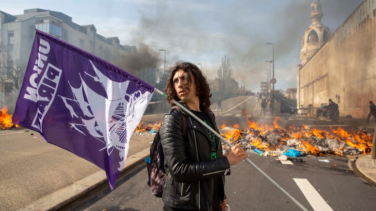 Sacha Coatantiec (el apellido es de origen bretón) porta la bandera morada de su sindicato estudiantil, Acción Pirata. Tiene 21 años, melena rizada y va vestido con camiseta negra y chupa de cuero. Estudia Geografía en la universidad y se coloca, junto a varios compañeros, en cabeza de la manifestación de su ciudad, Nantes. Él es el líder y fundador del sindicato, que agrupa a 80 estudiantes. Los jóvenes se han sumado tarde a estas jornadas de protesta (la de este martes 28 ha sido la décima) contra el decreto de Emmanuel Macron que eleva la edad de jubilación, pero ya no hay quien los apee.