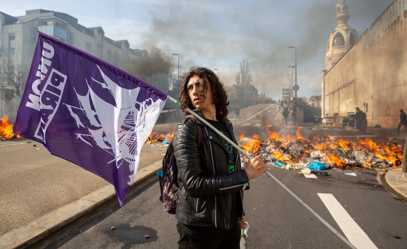 Sacha Coatantiec (el apellido es de origen bretón) porta la bandera morada de su sindicato estudiantil, Acción Pirata. Tiene 21 años, melena rizada y va vestido con camiseta negra y chupa de cuero. Estudia Geografía en la universidad y se coloca, junto a varios compañeros, en cabeza de la manifestación de su ciudad, Nantes. Él es el líder y fundador del sindicato, que agrupa a 80 estudiantes. Los jóvenes se han sumado tarde a estas jornadas de protesta (la de este martes 28 ha sido la décima) contra el decreto de Emmanuel Macron que eleva la edad de jubilación, pero ya no hay quien los apee.