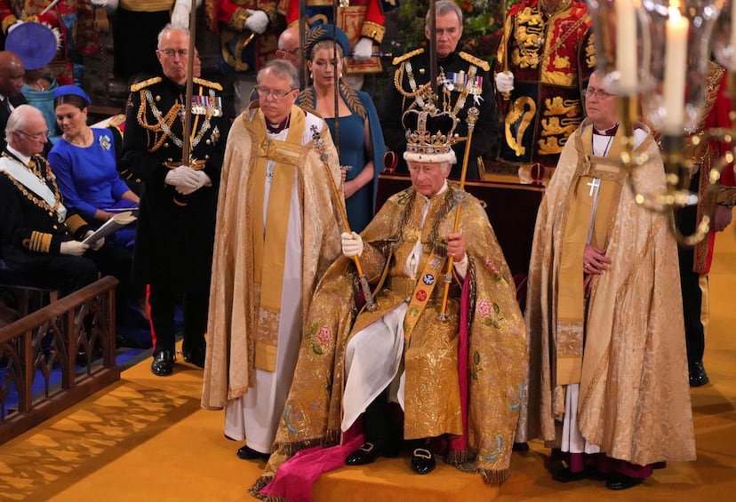 La corona de San Eduardo y la corona imperial; orbes, cetros y espadas; un trono construido siglos atrás con el único propósito de dejar claro el dominio de Inglaterra sobre Escocia; una piedra del destino sobre la que Carlos III, como su madre antes, hizo llevar desde Edimburgo hasta Londres para poder encajarla en el hueco dispuesto bajo la silla de Eduardo. Y juramentos. Y liturgia. Declaraciones de lealtad a las leyes del reino y a la Iglesia anglicana, de la que el monarca es supremo gobernador.