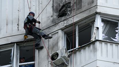 Al menos dos bloques del extremo suroeste de esta gigantesca ciudad han sido alcanzados por los drones. En las imágenes difundidas en las redes rusas, se aprecian ventanas rotas y la parte superior de uno de estos edificios quemada. Uno de ellos se sitúa en la calle de Profsoyúznaya 98, dentro del último anillo de la metrópolis. El otro, en la calle de Atlasova del distrito Nuevo Moscú, al otro lado de la autopista. El alcalde, que subrayó que los dos inmuebles habían sufrido “daños menores”, anunció que los inquilinos de los pisos fueron desalojados durante unas horas.