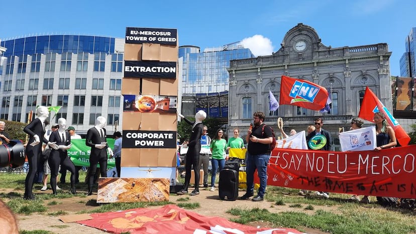 Diversos activistas de distintas organizaciones realizaron una protesta simbólica contra el acuerdo comercial entre la Unión Europea y los países del bloque MERCOSUR, mientras los líderes de los países de la UE y América Latina se reunían en Bruselas el pasado lunes, 17 de julio.