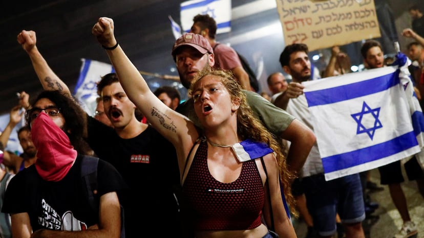 Además, cinco importantes periódicos israelíes han llegado a los quioscos con una primera página negra con un único y pequeño mensaje en letras blancas ―“Un día negro para la democracia israelí”― y la fecha de este martes. En el reverso se puede leer: “La locomotora de Israel nunca se rendirá”, en referencia al sector de la alta tecnología, que financia los anuncios en los tres diarios generalistas de mayor circulación (Yediot Aharonot, Israel Hayom y Haaretz) y dos económicos (Calcalist y The Marker). Lo llaman la locomotora porque aporta más del 10% del empleo y un 15% del PIB de Israel. Sus empresarios y trabajadores son una de las puntas de lanza de la protesta, tanto por extracción social y lugar de residencia como por su dependencia de que el exterior siga viendo al país como una democracia con una economía abierta y con seguridad jurídica.