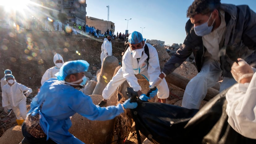Youssef, un soldado que ha combatido en los tres conflictos que ha vivido Libia desde la caída del régimen de Gadafi en 2011, sostiene sin asomo de duda: “La situación en Derna es mucho más grave que en los peores momentos de la guerra”. El centro de la cuarta ciudad más poblada del país, más de 100.000 habitantes antes de la tormenta Daniel, parece haber sufrido un bombardeo en las últimas horas. La que fuese uno de los bastiones del Estado Islámico en 2016, ha quedado ahora reducida a poco más que escombros, coches convertidos en hierros retorcidos y esqueletos de edificios que pueden derrumbarse en cualquier momento. En medio de la visión apocalíptica, grupos de voluntarios vestidos con equipos de protección individual (EPI) y batas desechables siguen buscando supervivientes, pero solo encuentran cadáveres.