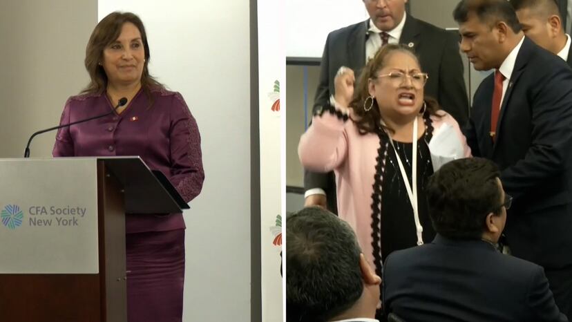 La presidenta de Perú, Dina Boluarte, fue increpada por dos manifestantes este miércoles cuando participaba en un evento de la CFA Society de Nueva York. La reunión agrupaba a importantes financieras de Wall Street y representantes internacionales.