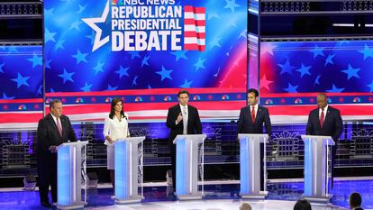 El debate se acercaba a su final cuando los moderadores han preguntado a los candidatos por el aborto. Tim Scott ha defendido un “límite” federal de 15 semanas de gestación para abortar. Ron DeSantis, que ha promulgado en Florida una ley que los prohíbe desde las seis semanas, ha dicho que entiende que otros Estados tengan legislaciones distintas, pero que él defiende una “cultura de la vida”. Christie se ha mostrado partidario de que sean los Estados los que regulen. Haley ha dicho que no es realista pensar en una ley federal, se ha declarado “provida”, pero ha asegurado no juzgar a quienes se declaran “proelección”. Ha animado a buscar un consenso y que la cuestión deje de ser divisiva. Ramaswany ha divagado de nuevo. “Este es el ingrediente que falta en este movimiento: la responsabilidad sexual de los hombres”, ha dicho subrayando que los test de paternidad son muy fiables, sin que quedase muy claro cómo iba eso a evitar los abortos. “No se trata de los derechos de los hombres frente a los derechos de las mujeres. Se trata de derechos humanos”, ha dicho en la misma línea.