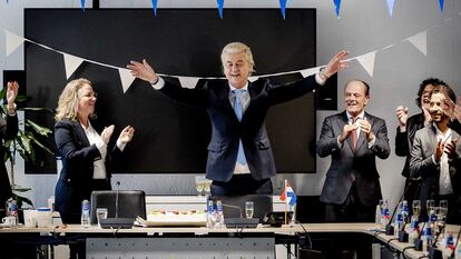 La sacudida ocasionada por la victoria de Geert Wilders (60 años), líder de la extrema derecha holandesa, al convertirse su Partido por la Libertad (PVV) en el más votado en las elecciones de este miércoles en Países Bajos no ha sido digerida todavía por el resto del arco político. La sorpresa es mayúscula porque supone la posible formación de una coalición donde el peso específico recaería en un candidato xenófobo y euroescéptico. Un panorama poco asociado con la tolerancia y moderación en la que Países Bajos ―la quinta economía de la UE― ha preferido hasta ahora mirarse. Wilders ha logrado 37 escaños en los comicios, pero es un corredor de fondo. Después de 25 años como diputado y una trayectoria de rechazo radical al Islam, ha ido moderando su discurso al ver que se aupaba en los sondeos. Ahora, tras la victoria, dice que esa islamofobia sigue “en el ADN” de su formación, “pero hay otras prioridades”. Con la meta a la vista, necesita socios fiables a la derecha o incluso el centro y tendrá que aplicarse para llegar a ser primer ministro.