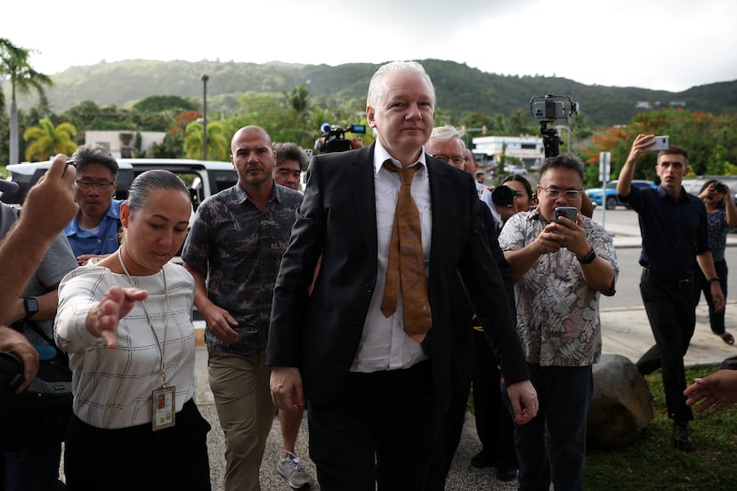 Julian Assange ha llegado con traje y corbata, aunque con aspecto algo desaliñado, a su cita con la libertad. El fundador de Wikileaks ha comparecido a primera hora del miércoles en el tribunal de distrito de Saipán, en el territorio de las Islas Marianas del Norte. Allí, la jueza Ramona Manglona ha ratificado en una vista el acuerdo alcanzado con el Departamento de Justicia de Estados Unidos. Assange se ha declarado culpable de un delito de violación de la Ley de Espionaje, por el que ha sido condenado a una pena ya cumplida de unos cinco años de prisión. Ha salido del juzgado como “un hombre libre”, como ha dicho la jueza, tras 12 años recluido, siete de ellos en la Embajada de Ecuador en Londres y otros cinco en una cárcel de máxima seguridad británica. Ya vuela rumbo a Australia, donde tiene previsto aterrizar hacia las 19:00 hora local (las 11:00 en la España peninsular).