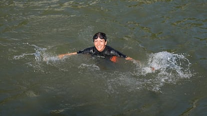 La alcaldesa de París se ha dado este miércoles su primer chapuzón en el Sena. Vestida con un traje de neopreno y unas gafas de piscina, Anne Hidalgo se ha lanzado al río y ha cumplido la promesa de nadar en sus aguas, a nueve días del inicio de los Juegos Olímpicos, el 26 de julio. El acto es simbólico. Nadar en el río está prohibido desde hace un siglo por la contaminación y el Consistorio se había puesto manos a la obra para sanear sus aguas verdosas y opacas. El megaevento deportivo, que incluye pruebas deportivas en este símbolo capitalino, aceleró el proceso de saneamiento.
