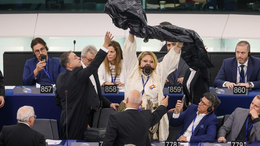 La presidenta del Parlamento Europeo, Roberta Metsola, ha expulsado este jueves del pleno a Diana Sosoaca, una eurodiputada ultra rumana que interrumpió la sesión a voces desde su escaño con un bozal puesto, una imagen religiosa y una gran bolsa de basura mientras acusaba a la presidenta de la Comisión, Ursula von der Leyen, de “matar a gente”. Esta diputada, conocida antivacunas del partido rumano AUR, ya se había puesto el bozal y proferido gritos desde su escaño antes de que Metsola, que le advirtió de que era la tercera vez que trastocaba el desarrollo normal de la sesión, le instara a abandonar el pleno. En el vídeo que acompaña esta noticia se puede ver la secuencia completa.