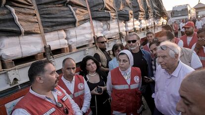 El lugar, con algún bombardeo israelí de fondo mientras hablaba, era parte del mensaje. Podría haberlo dicho en Bruselas, pero el jefe de la diplomacia europea, Josep Borrell, ha elegido este lunes el desangelado arco de entrada a Rafah, el paso fronterizo entre Egipto con Gaza, para denunciar las “violaciones masivas de derechos humanos” cometidas por Israel a apenas medio kilómetro de donde hablaba. Lo dijo antes de conocer de primera mano ―sorprendiéndose e indignándose― las restricciones israelíes a la entrada de ayuda humanitaria a Gaza y al final de una carretera desértica con camiones con ayuda humanitaria a los lados, por el cuello de botella para su ingreso a Gaza. Superan el millar y los conductores, que hace meses esperaban una o dos semanas para entrar, tardan ahora hasta tres meses, como le contó Lofty S. Geith, responsable de operaciones de la Media Luna Roja Egipcia, al visitar el centro de logística.
