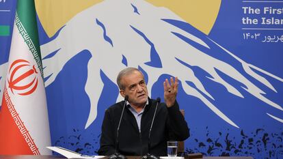 El nuevo presidente iraní, Masud Pezeshkian, se ha mostrado este lunes dispuesto a establecer conversaciones directas con Estados Unidos para reactivar el acuerdo nuclear de 2015, en la primera rueda de prensa que ha ofrecido tras asumir su cargo el 31 de julio. Esa mano tendida la ha condicionado a que Washington demuestre que “no es hostil” a Irán, una afirmación vaga con la que el mandatario recupera una de sus principales promesas de campaña. Ese compromiso fue el de retomar la negociación para aliviar las sanciones occidentales contra la economía iraní, una decisión que depende de la reactivación del pacto que permitió la supervisión internacional del programa nuclear del país para garantizar que Teherán no fabricase armas atómicas. Pezeshkian no ha elegido un día cualquiera para comparecer. Este lunes se cumplen dos años del inicio de las protestas contra el régimen desatadas por la muerte bajo custodia policial de Yina Mahsa Amini, de 22 años, detenida tres días antes por llevar el velo obligatorio de forma “inapropiada”.