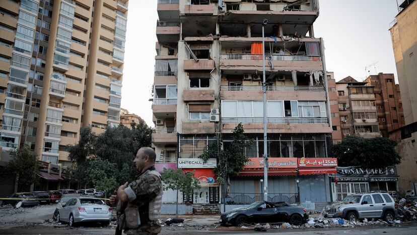 En Cola, el edificio bombardeado en el centro de Beirut está vigilado esta mañana por vehículos de las Fuerzas Armadas, junto a los escombros caídos sobre los capós de los coches. La imagen da cuenta de un ataque muy selectivo: el proyectil destrozó los muros de la cuarta planta de un inmueble de 10, sin derribar los pilares y dejando un agujero en medio.
