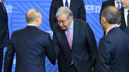 “Necesitamos la paz en Ucrania. Una paz justa, de acuerdo con la Carta de Naciones Unidas, con las resoluciones de su Asamblea General y con el derecho internacional”, ha espetado el máximo dirigente de Naciones Unidas ante su anfitrión, el presidente ruso. Por su parte, Ucrania ha criticado a Guterres por haber asistido al foro de los BRICS y no a su cumbre de paz en Suiza. El secretario general de la ONU se fundió también en un abrazo con el dirigente bielorruso, Alexandr Lukashenko, que mantiene encarcelados a sus opositores en paradero desconocido desde hace años, le obsequió con una estatuilla: “Nuestras cigüeñas, un símbolo de paz”.