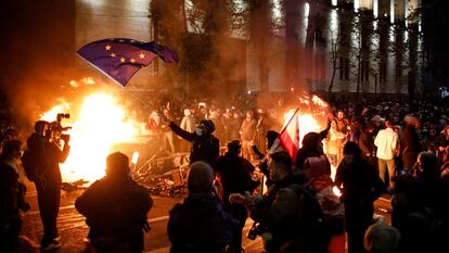 “¿Sirven ustedes a Georgia o a Rusia?”. La imagen de la menuda presidenta de Georgia, Salomé Zurabishvili, espetándole esa frase a un grupo de agentes antidisturbios protegidos por cascos y escudos refleja el choque de legitimidades y de dirección política que vive el país caucásico desde las elecciones del pasado 26 de octubre, que revalidaron en el poder al partido populista y cada vez más prorruso Sueño Georgiano, pero que no han sido reconocidas por la oposición ni por la jefa de Estado bajo la acusación a las autoridades de un fraude masivo. La crítica situación del país se ha visto sacudida de nuevo por el anuncio del Gobierno de que suspenderá el proceso de adhesión a la Unión Europea hasta 2028, lo que ha echado a la calle a los sectores más proeuropeos de la población georgiana en una protesta que culminó este jueves en disturbios y fue duramente reprimida por la policía, con decenas de heridos y al menos 43 detenidos.