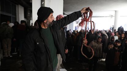 Aman Al Usbuh llora desconsoladamente: “¡No existen las cámaras! ¡No existen!”. Cuenta que uno de sus hermanos fue arrestado en un control militar de carretera en 2011, el año que comenzó la revuelta duramente reprimida por El Asad, que degeneró en guerra civil, y que se enteró, por un expreso en Saidnaya, que coincidió con él hasta 2018. De lo que le pasó a su hermano entre ese año y este lunes (otro día en el que ha acudido con la esperanza de encontrarlo) no sabe nada. “¿Dónde estaban las organizaciones internacionales cuando todo esto pasaba? ¿Por qué tenemos que estar ahora cavando para buscar a mi hermano? Solo nos queda tener fe en Dios hasta el último momento, porque creemos en Él y todo está en su mano”.