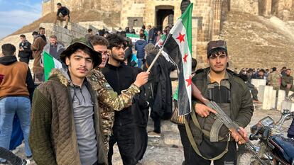 Bajo la imponente ciudadela de Alepo, el ambiente es de día festivo. Personas llegadas de todos los lugares ondean banderas de la revolución y se hacen selfies con el monumento medieval de fondo, entre vendedores de globos, caramelos y frutos secos, música atronadora y un hombre que ha llevado un camello para que se monten en él niños y mayores e inmortalicen la ocasión. Sabah es una de ellas: “Es la primera vez que visito la ciudadela en casi 14 años”. Y no solo eso: tampoco había podido reencontrarse hasta ahora con su padre, que se quedó tras las líneas del frente porque ella huyó a territorio bajo control de los que se habían levantado en armas contra el régimen.