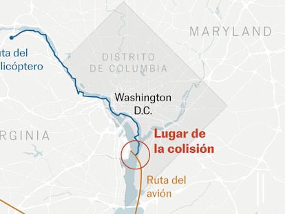 Un avión comercial con 60 pasajeros y cuatro tripulantes colisionó este miércoles en Washington con un helicóptero militar sobre el río Potomac cuando efectuaba la maniobra de aproximación al aeropuerto Ronald Reagan. El avión siniestrado (vuelo American Eagle 5342), operado por PSA Airlines, subsidiaria de American Airlines, era un Bombardier CRJ-700 que había partido de Wichita (Kansas) en un vuelo interior, según ha indicado la autoridad aérea (FAA, por sus siglas en inglés). El accidente se produjo a las 20.48, hora local (2.48 en la España peninsular), cuando el aparato chocó en pleno vuelo con un helicóptero Sikorsky H-60 (Black Hawk) que realizaba maniobras de entrenamiento. El helicóptero llevaba tres militares a bordo. Las autoridades han confirmado que no hay supervivientes del accidente.