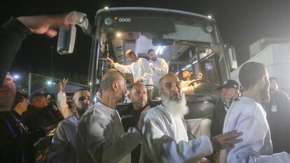 Poco después de la entrega de los cadáveres, los autobuses con reclusos salieron de la cárcel de Ofer, en Cisjordania. Las autoridades israelíes han proyectado en un edificio cercano un mensaje amedrentador en árabe acompañado del dibujo de un ojo gigante: “Nuestros ojos os están mirando”. Los presos palestinos excarcelados fueron recibidos en Ramala por una multitud.
