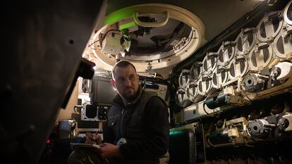 Fuera del blindado, un AHS Krab suministrado por Polonia, el comandante Polishchuk utiliza botas. Pero tanto él como los artilleros Yegor Vlasov y Oleksandr Strelnytskyi se quedan en calcetines cuando acceden a su interior, por no meter más barro, que en esta lluviosa época del año está por todas partes y especialmente en el bosque donde se camuflan. Últimamente, se pasan el día corriendo del búnker donde viven al carro de combate, descalzándose y volviéndose a calzar cuando acaban la tarea, porque los ataques aquí no se han detenido, sino todo lo contrario: van a más. “Durante el último mes, nuestras posiciones fueron atacadas más de cien veces en siete días”, asegura Andrii Goretskyi, comandante de batería de esta brigada, es decir, el superior de esta unidad de artilleros y de otras tres idénticas.