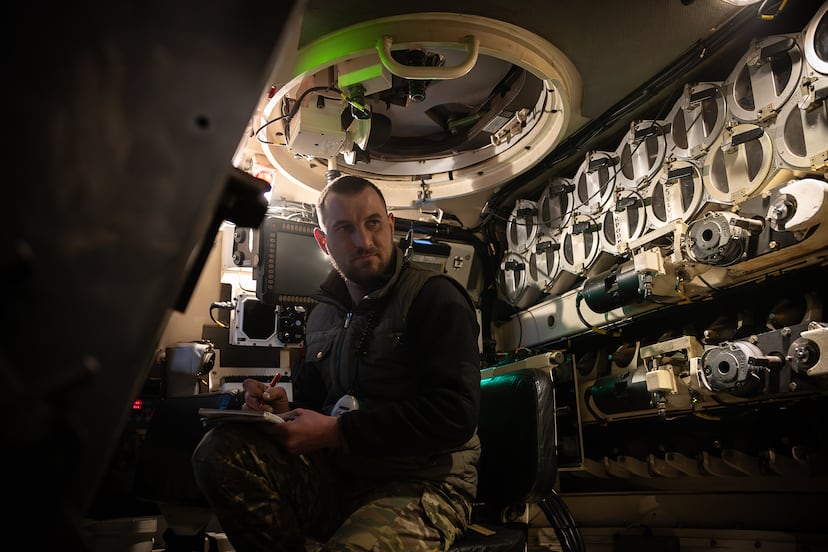 Fuera del blindado, un AHS Krab suministrado por Polonia, el comandante Polishchuk utiliza botas. Pero tanto él como los artilleros Yegor Vlasov y Oleksandr Strelnytskyi se quedan en calcetines cuando acceden a su interior, por no meter más barro, que en esta lluviosa época del año está por todas partes y especialmente en el bosque donde se camuflan. Últimamente, se pasan el día corriendo del búnker donde viven al carro de combate, descalzándose y volviéndose a calzar cuando acaban la tarea, porque los ataques aquí no se han detenido, sino todo lo contrario: van a más. “Durante el último mes, nuestras posiciones fueron atacadas más de cien veces en siete días”, asegura Andrii Goretskyi, comandante de batería de esta brigada, es decir, el superior de esta unidad de artilleros y de otras tres idénticas.