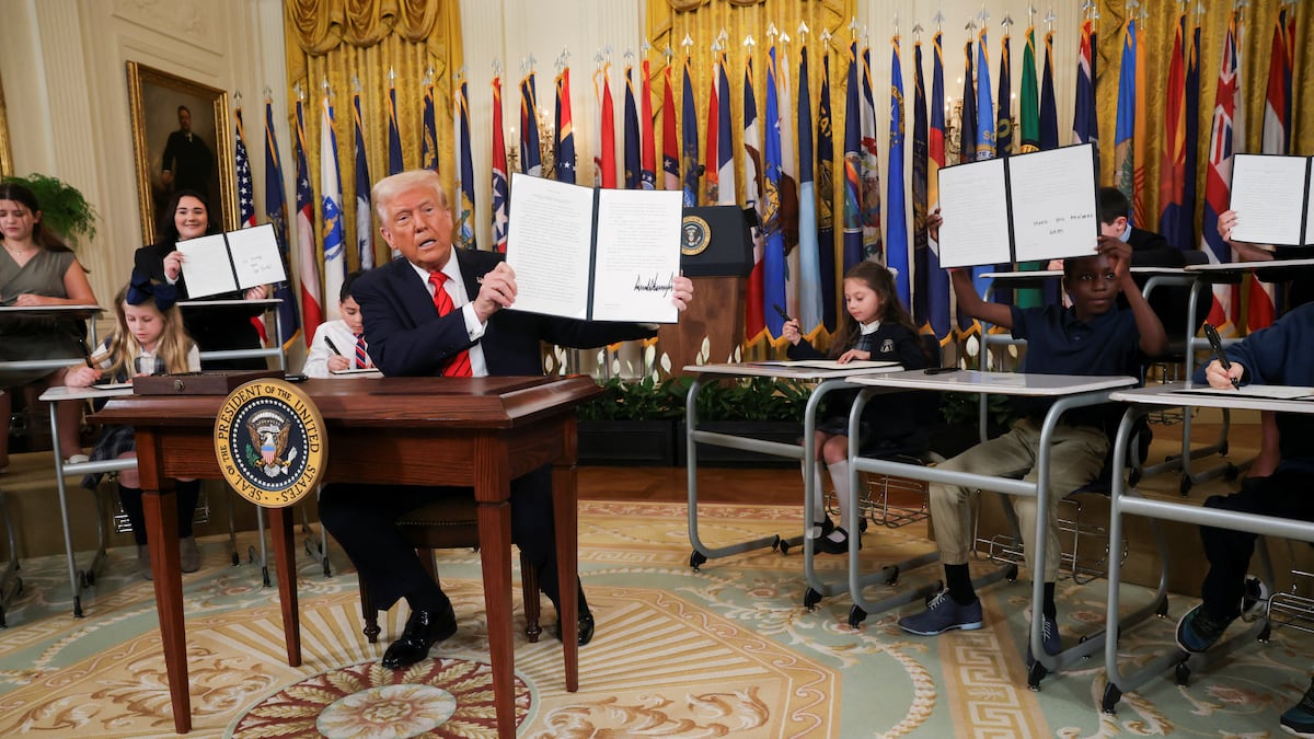 El presidente de Estados Unidos cuidó la escenografía para cumplir ―al menos parcialmente― una de sus promesas favoritas de campaña. Firmó el decreto sentado en una pequeña mesa de madera rodeado de niños y adolescentes que firmaron sus propias réplicas y las exhibieron imitando a Trump en una de esas imágenes de esta era que se quedan grabadas en la retina.