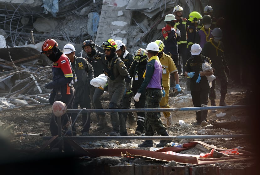 En Tailandia, casi toda la atención está centrada en el rascacielos en construcción que se hizo añicos en cuestión de segundos. Los servicios de rescate han anunciado este sábado que hay al menos 15 supervivientes entre los escombros. El Departamento de Prevención y Mitigación de Desastres ha informado de que está trabajando a contrarreloj para superar la crítica ventana de supervivencia de tres días y llegar a los atrapados. “Estamos intentando llevarles agua y comida. La dificultad radica en que algunos están atrapados a unos tres metros de profundidad”, ha explicado el director del Departamento de Bomberos de Bangkok. Como el edificio colapsó como un castillo de naipes y los escombros siguen cayendo, los equipos han optado por no utilizar maquinaria pesada. El viceprimer ministro tailandés, Anutin Charnweerakul, ha confirmado que la última cifra que se baraja de desaparecidos es de unos 50. “Mantenemos la esperanza. Estamos trabajando sin descanso y a contrarreloj para asegurarnos de que todo el mundo esté a salvo”, dijo a reporteros.