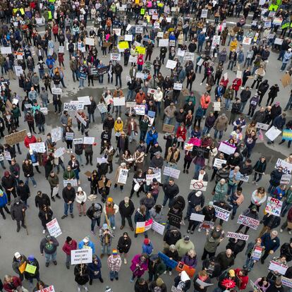 Casi 600.000 personas se habían inscrito en todo EE UU para asistir a las marchas, según Indivisible, una de las organizaciones que lidera el movimiento en colaboración con una coalición nacional formada por organizaciones de derechos civiles, veteranos, grupos de mujeres, sindicatos y defensores de la comunidad LGBTQ+. Pero el hecho de celebrarse en lugares públicos permite suponer que la cifra de participantes reales —otra costumbre muy estadounidense: inscribirse para asistir a un evento abierto— fue sensiblemente mayor.