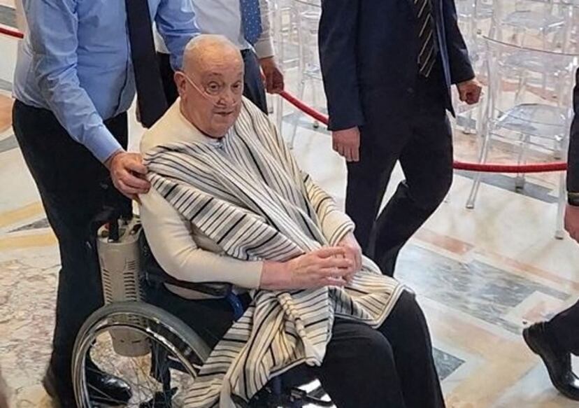 El papa Francisco aparece por sorpresa en la basílica de San Pedro en camiseta, silla de ruedas y con una manta