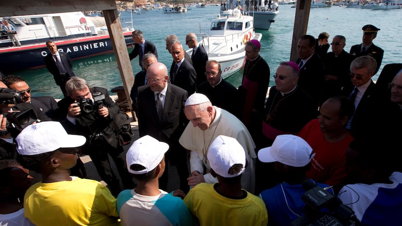 La cuestión no siempre se quedó en palabras. En abril de 2016, Bergoglio viajó a la isla griega de Lesbos. El motivo era denunciar sobre el terreno el drama de los refugiados, pero ya en el vuelo de regreso a Roma los periodistas que acompañaban habitualmente la comitiva papal se percataron de que el avión iba más lleno que a la ida. Con extrema discreción, el Papa había pactado con las autoridades griegas la acogida en el Vaticano de 12 refugiados sirios, entre ellos seis menores. Más que un pequeño gesto, constituía un desafío resumido en una frase: “Europa es la patria de los derechos humanos, y cualquiera que ponga pie en suelo europeo debería poder experimentarlo”. Y añadió: “Muchos de los refugiados que se encuentran en esta isla y en otras partes de Grecia están viviendo en unas condiciones críticas, en un clima de ansiedad y miedo, a veces de desesperación, por las dificultades materiales y la incertidumbre del futuro”. Francisco, junto al patriarca ortodoxo Bartolomeo y el arzobispo Jerónimo de Atenas, firmaron una declaración conjunta en el que pidieron a las comunidades religiosas que hicieran todo lo posible por recibir, asistir y proteger a más personas, y a todos los Estados a que “extiendan el asilo temporal, ofrezcan el estatuto de refugiados a más personas”. Ya desde Roma, y en diferentes ocasiones, el Papa pidió que cada parroquia, cada comunidad religiosa, cada santuario y cada monasterio acogiera a una familia.