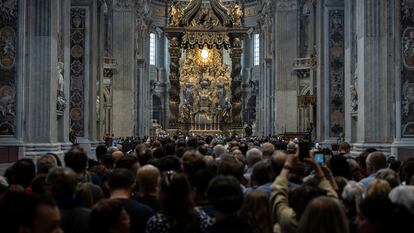 A lo largo de la fila que serpenteaba por la plaza de San Pedro se escuchaban muchos idiomas. Un matrimonio de alemanes, con dos niños, que estaba en Roma haciendo turismo, se acercó a la cola después de cenar. Llevaban dos horas esperando, y eso que les habían dejado pasar por un acceso preferente por llevar un cochecito con un niño. “¿Cuándo llegamos?”, preguntaba el hermano mayor, de cinco años.