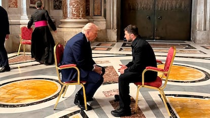 En alguna de las imágenes se ve incluso en una improvisada cumbre del más alto nivel al presidente de Francia, Emmanuel Macron, y al primer ministro británico, Keir Starmer, junto a ellos dos de pie conversando en ese mismo lugar de la basílica. Se ha tratado de un encuentro “positivo”, ha comentado el entorno de Macron, informa Reuters. Ambos líderes europeos arropan a Zelenski en unos contactos diplomáticos en los que Washington se muestra más alineado con Moscú, según las dos propuestas planteadas en las negociaciones y que han trascendido estos días.