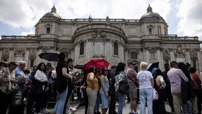 El difunto papa Francisco reposa ya en la basílica de Santa María la Mayor, según se entra, al fondo a la izquierda, donde ya este domingo ha habido largas colas para visitar su tumba. Hasta dos horas de espera, 31.000 personas contabilizadas a la una del mediodía y escenas de masificación que empujaron a pedir calma por megafonía. No se permite detenerse ante la lápida de Jorge Mario Bergoglio para agilizar el paso de la multitud. La prisa y la atención sobre el Pontífice no dejan, en realidad, prestar atención a otros detalles curiosos del templo, como el de sus sorprendentes compañeros de sepultura.