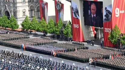 El putinismo funde poco a poco el sacrificio de decenas de millones de ciudadanos soviéticos en la Gran Guerra Patria de hace 80 años con su invasión de Ucrania actual para justificarla. El presidente ucranio, Volodímir Zelenski, recordó en la víspera que más de ocho millones de ciudadanos de su país murieron durante la invasión nazi. Sin embargo, en los carteles desplegados junto al Kremlin se lee “la victoria estará con nosotros”, en futuro, no en pasado. Uno de los puntos destacados del desfile ha sido la marcha de veteranos de la guerra actual. Un comandante de una unidad de drones galardonado con la orden Héroe de Rusia ha liderado el paso de un pelotón de fuerzas especiales.